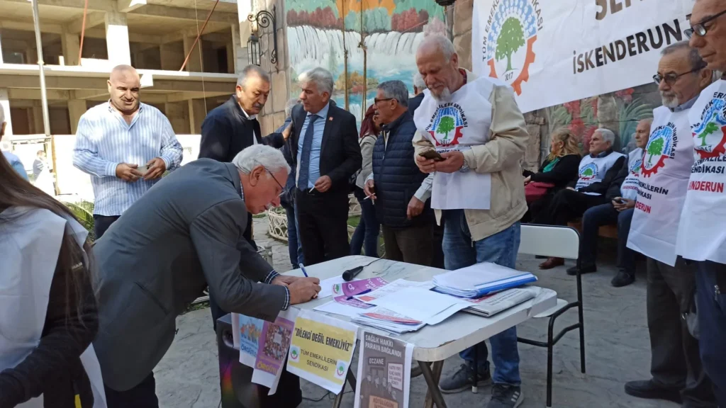 Basın açıklaması sonrasında, Tüm Emekliler Sendikası 2017 İskenderun Temsilciliği Şube Temsilciliği tarafından düzenlenen ve devam eden imza kampanyası standında vatandaşlardan imza toplandı.