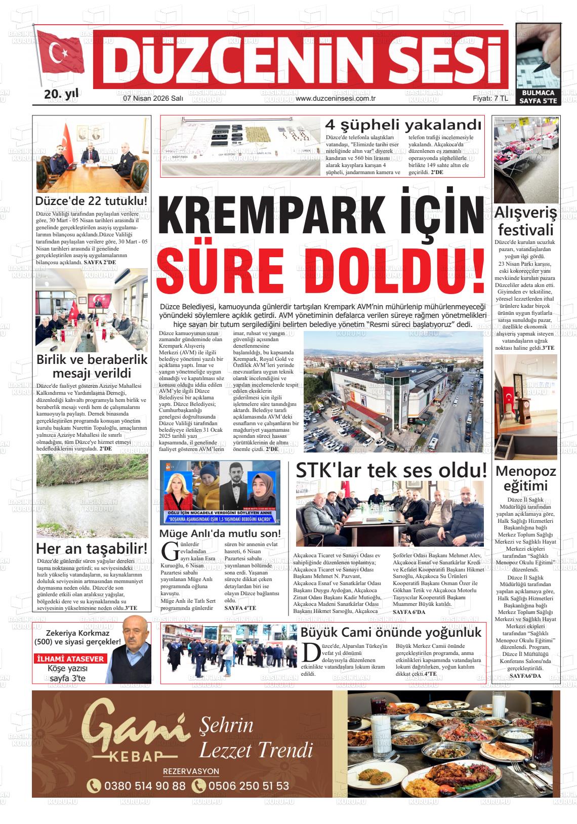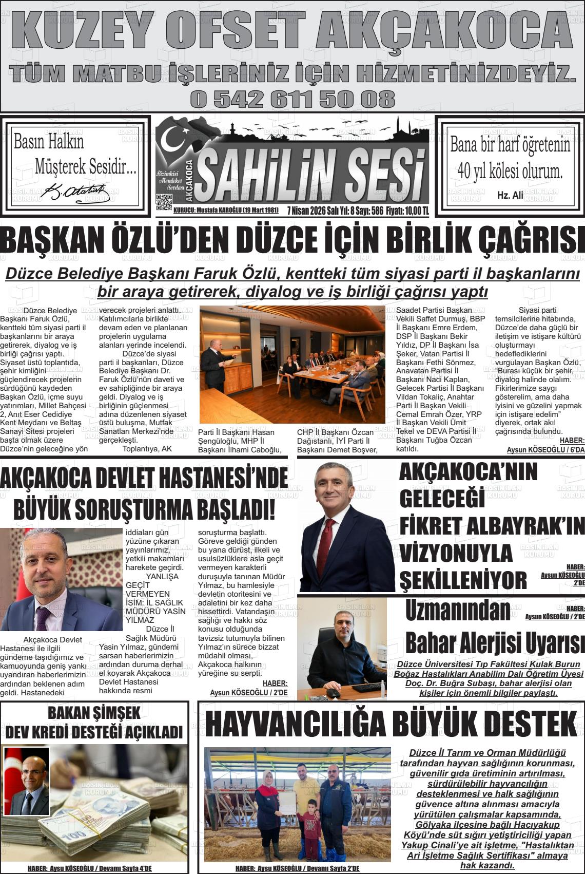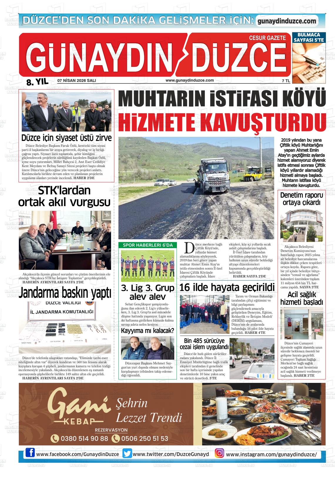 Düzce Yerel Gazeteleri 07 Nisan 2026, Salı Günü Manşeti
